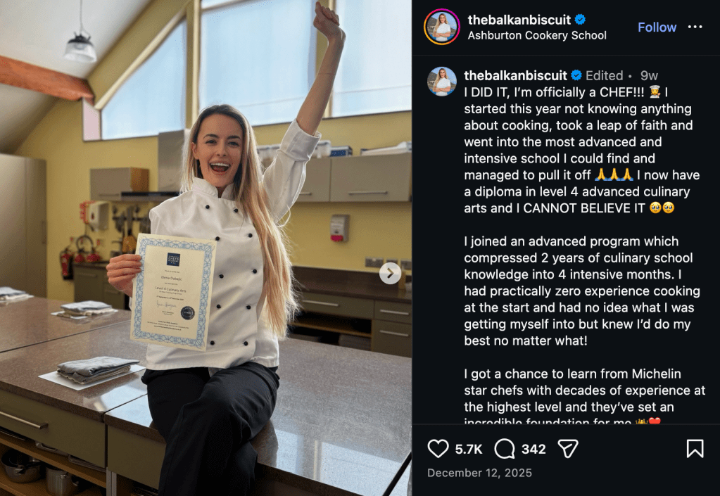 Unabhängig davon hat Ellie auf Instagram kürzlich offenbart: „ICH HAB’S GESCHAFFT, ich bin offiziell KOKSDEPP!!!“ In ihrem Bild sitzt Ellie auf einer Arbeitsplatte, trägt eine Kochuniform und präsentiert freudig ihr Diplomabschluss „Diplom der Stufe 4 in Fortgeschrittenen Kochkünsten.“