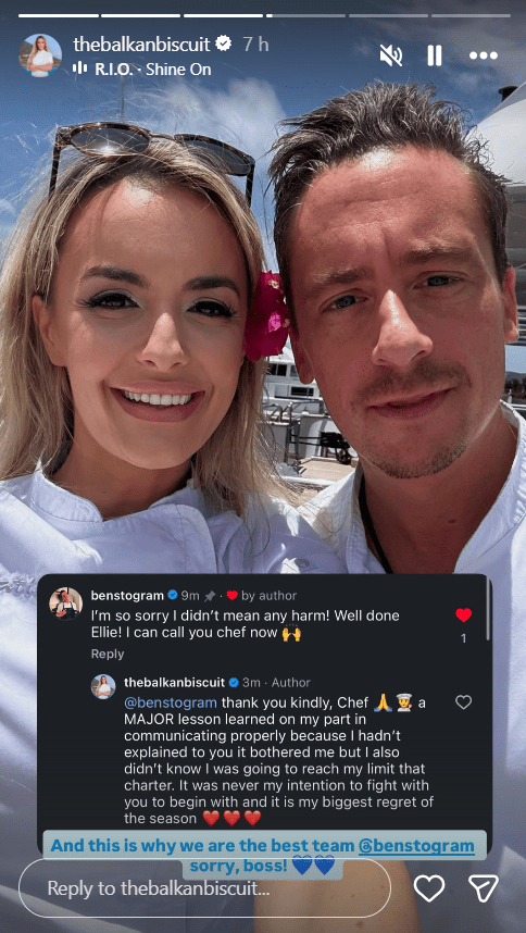„Es tut mir so leid, ich meinte nichts Böses! Gut gemacht, Ellie! Jetzt kann ich dich Chef nennen“, schrieb er und bezog sich darauf, wie Ellie nach den Dreharbeiten die Kochschule abschloss.